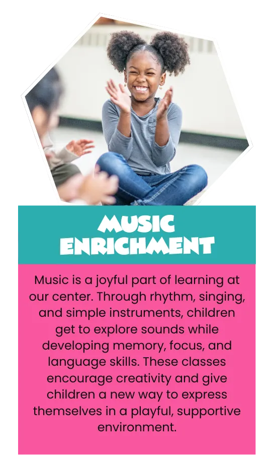 Music is a joyful part of learning at our center. Through rhythm, singing, and simple instruments, children get to explore sounds while developing memory, focus, and language skills. These classes encourage creativity and give children a new way to express themselves in a playful, supportive environment.
